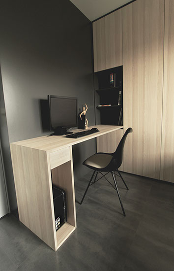 Le client souhaitait y intégrer un coin bureau et un maximum de rangements notamment de dressing.
