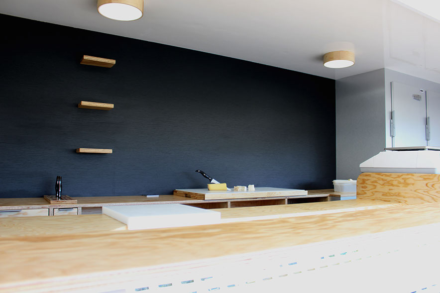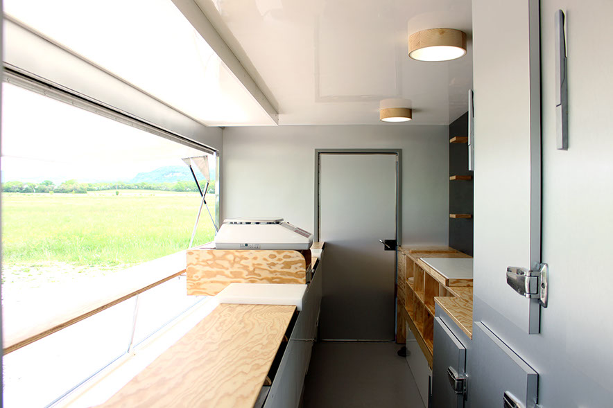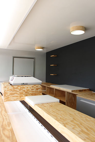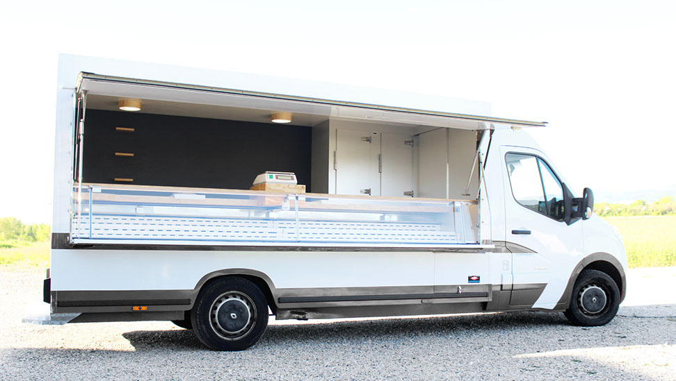 Transformation intérieure d'un camion vitrine anciennement de boucherie en fromagerie,