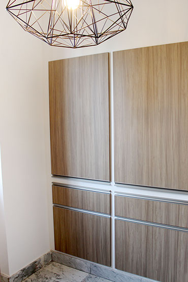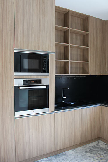 Mobilier en décor stratifié noisetier et plan de travail/crédence en granite du Zimbabwe finition cuir.
