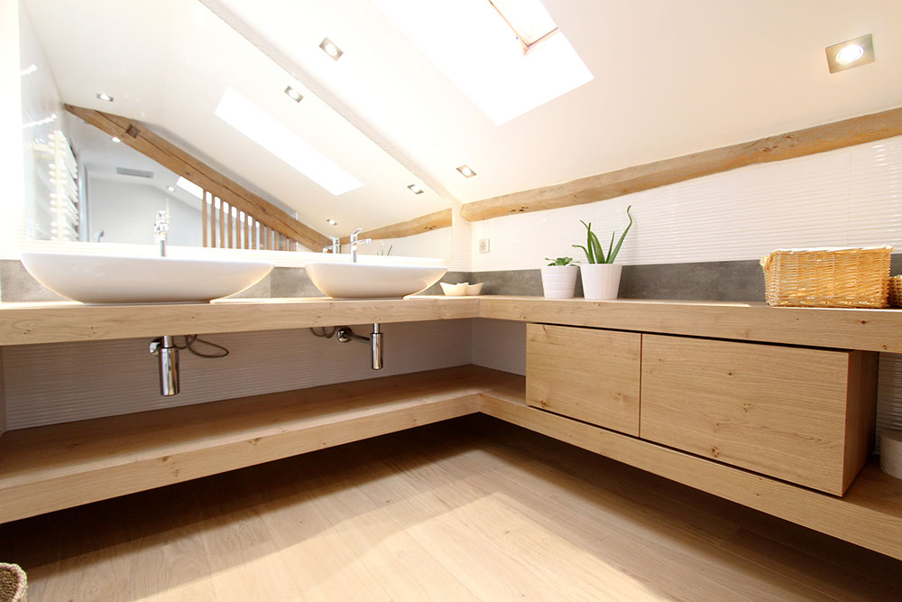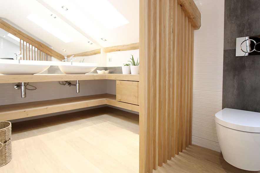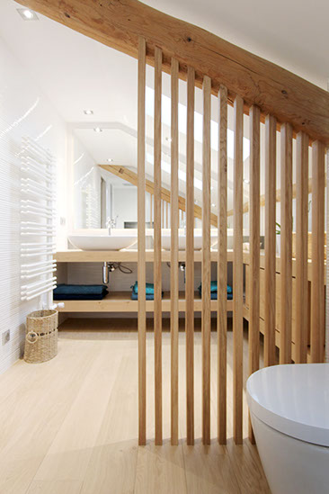 séparation du coin wc/douche par un claustra en chêne massif.