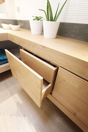 Fabrication d'un meuble de salle de bain minimaliste placage bois chêne à nœuds,