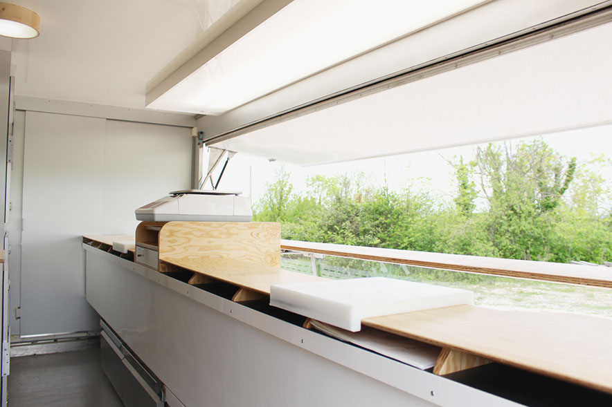 Transformation intérieure d'un camion vitrine anciennement de boucherie en fromagerie,
