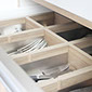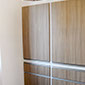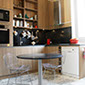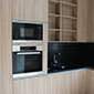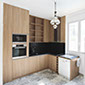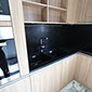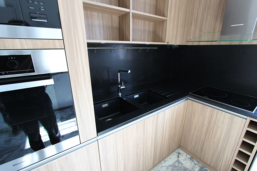 Mobilier en décor stratifié noisetier et plan de travail/crédence en granite du Zimbabwe finition cuir.